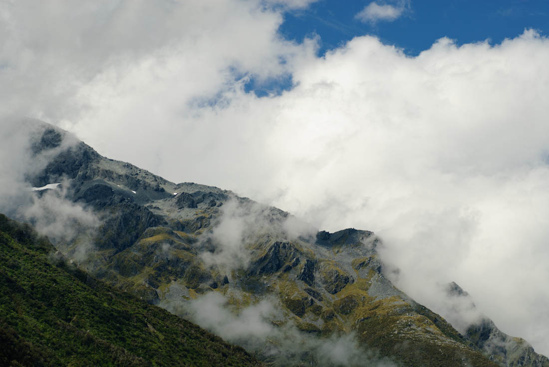 På toppen var der et udkigspunkt, som man udmærket lige kunne bruge til at ’nyde’ sejren. Her var også de første Kea fugle (en NZ papegøje) jeg har set hernede. De er meget nysgerrige, og kan godt lide at udforske ting. Desværre har de en mani med at bide i alt der er gummi. Ikke fordi de vil spise det, men måske fordi de kan lide at tygge i det? I hvert fald tog en af fuglene en ordentlig bid gummi fra en dørliste på en bil, før vi fik dem jaget væk…
